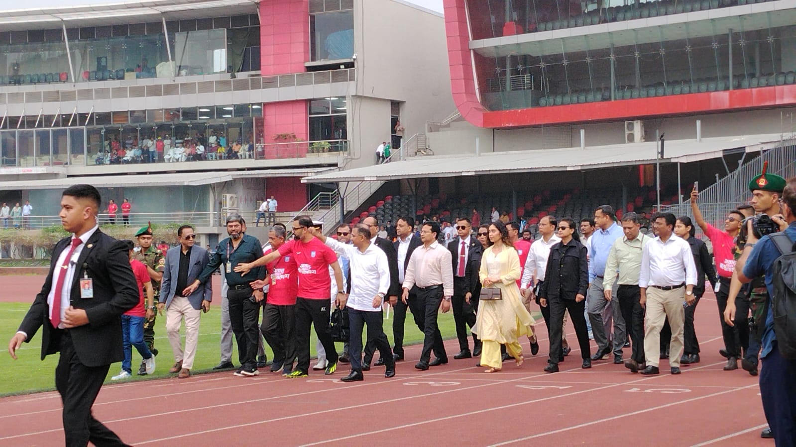 ভিআইপি প্রবেশপথ ব্যবহার করে তিনি সরাসরি মাঠে প্রবেশ করেন এবং ডাগআউটে গিয়ে খেলোয়াড়দের সঙ্গে সাক্ষাৎ করেন। সেখানে তিনি সবার সঙ্গে করমর্দন করেন ও সংক্ষিপ্ত আলাপচারিতার মাধ্যমে তাদের শুভেচ্ছা জানান। এরপর তিনি মাঠ ঘুরে দেখেন, অ্যাথলেটিক ট্র্যাক ধরে পুরো স্টেডিয়াম প্রদক্ষিণ করেন।